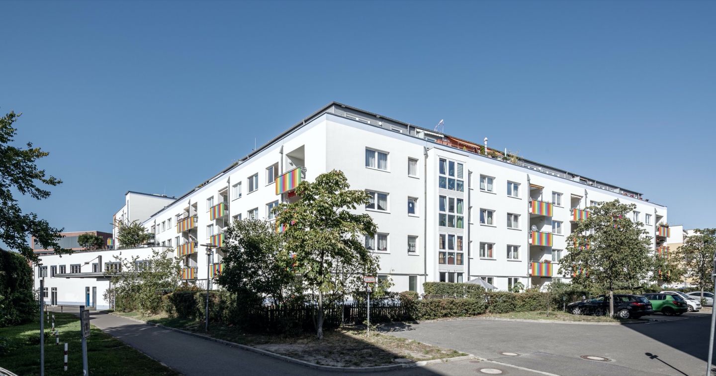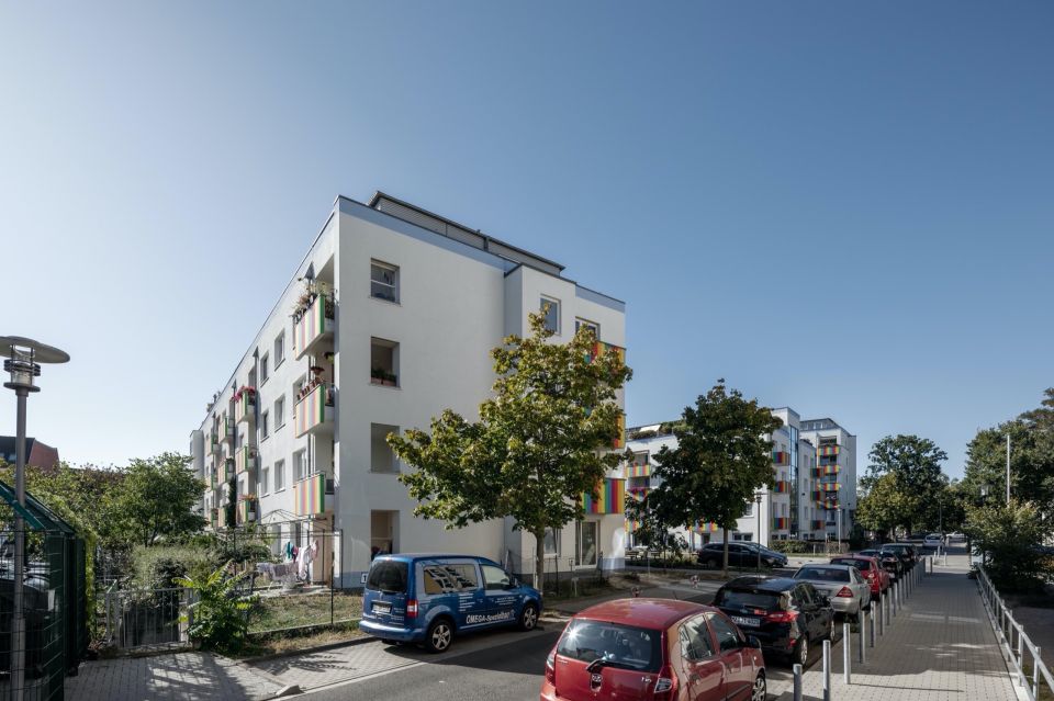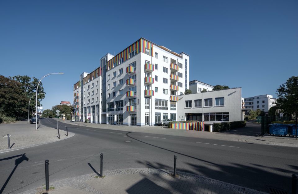In the Berlin district of Köpenick, not far from Köpenick's old town, Wendenschloßstraße runs parallel to the Dahme River. A residential and commercial complex was built here around 1997, which has 99 residential units, 23 commercial units and a total of 102 underground and outdoor parking spaces. Architecturally, the balconies, newly renovated in rainbow colors, are a striking feature of this property.